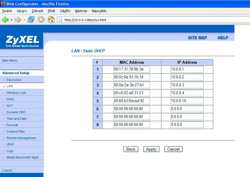 Mám router Zyxel Prestige 650H a na něm 3 PC. Router střídavě přiděluje každému PC 3 "vnitřní" IP adresy (192.168.1.33 - 35). Kvůli několika programům (např. eMule) potřebuju, aby každé PC mělo trvale stejnou IP adresu. Jak to v routeru resp. v jednotlivých kompech nastavím? Díky předem...