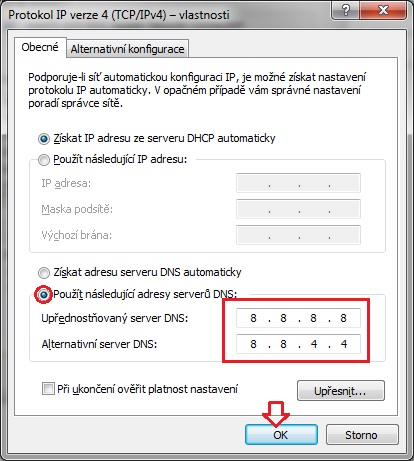 Zkus ve vlastnostech sítě nastavit DNS ruč ně na 8.8.8.8 a 8.8.4.4