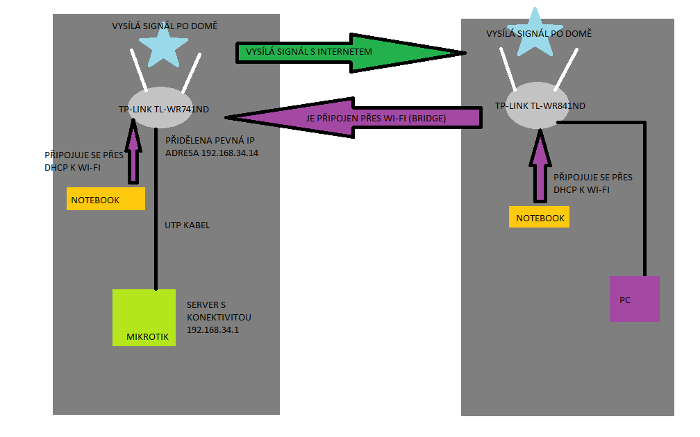 Mám však problém s konfigurací klienta, který je zapojen malinko jinak. Nevede k němu UTP kabel, ale připojuje se svým TP-LINKEM 841 k jinému uživateli na jeho TP-LINK 741 a v bridge modu ještě vysílá po domě signál. Potřebuji zachovat funkčnost wi-fi obou routerů i funkčnost všech LAN portů obou routerů. Internet však ale funguje vždy jen na jednom routeru a nevím si s tím už opravdu rady. Poradí mi prosím někdo, jakým způsobem nakonfigurovat routery, aby jely oba současně? níže zjednodušené schéma sítě