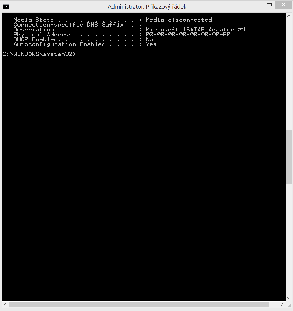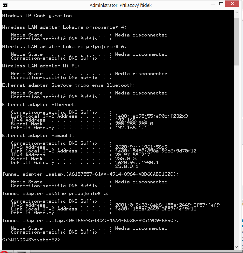 když v příkazové řádce napíšeš ipconfig, co se ti ukáže u ethernetu (pokud máš zapojený kabel) ?