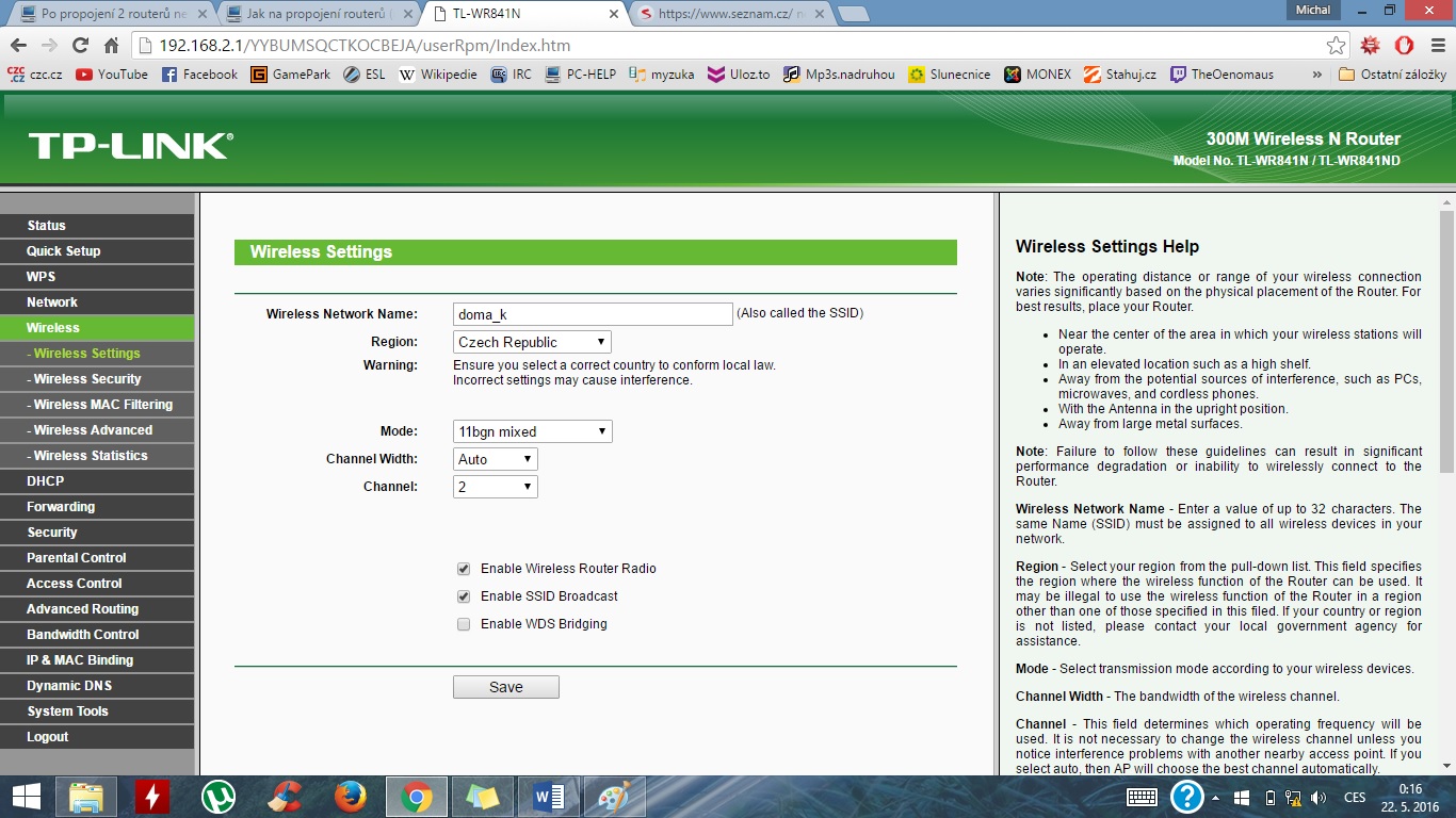 2. router: TP-LINK TL-WR841N (přízemí, plánovaný na rozšíření, propojen s Asusem kabelem z LAN do LAN)