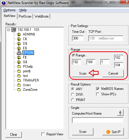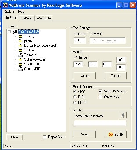 Stáhni se netbrute http://www.rawlogic.com/netbrute/ , spusť (na W7), nech proskenovat PC s XP, měl bys vidět něco takového: