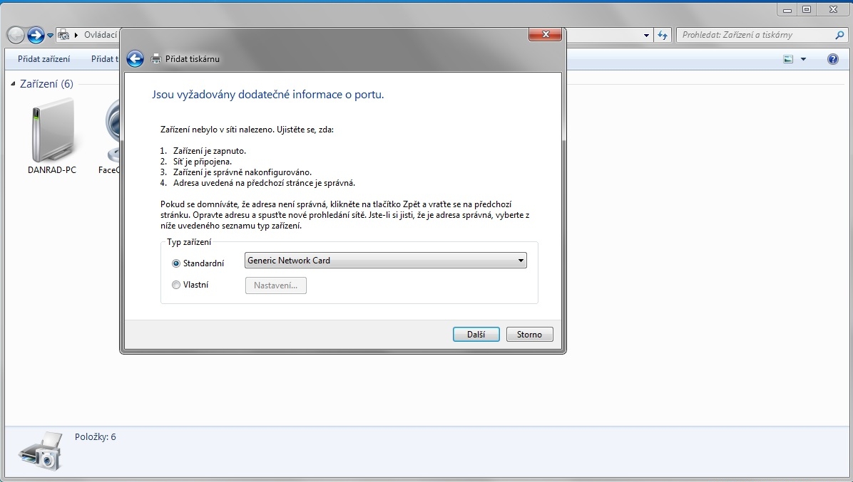 Tiskárnu jsem dal připojit dle Vašeho návodu, ručně. Tiskárna se i v nainstalovaných tiskárnách /W7/ zobrazila, ovšem nikoliv v síťových zařízeních. Při pokusu o vytisknutí "Testovací stránky" či jakékoliv jiné to vždy skončí hlášením "Tiskárna neodpovídá"...viz screeny níže.