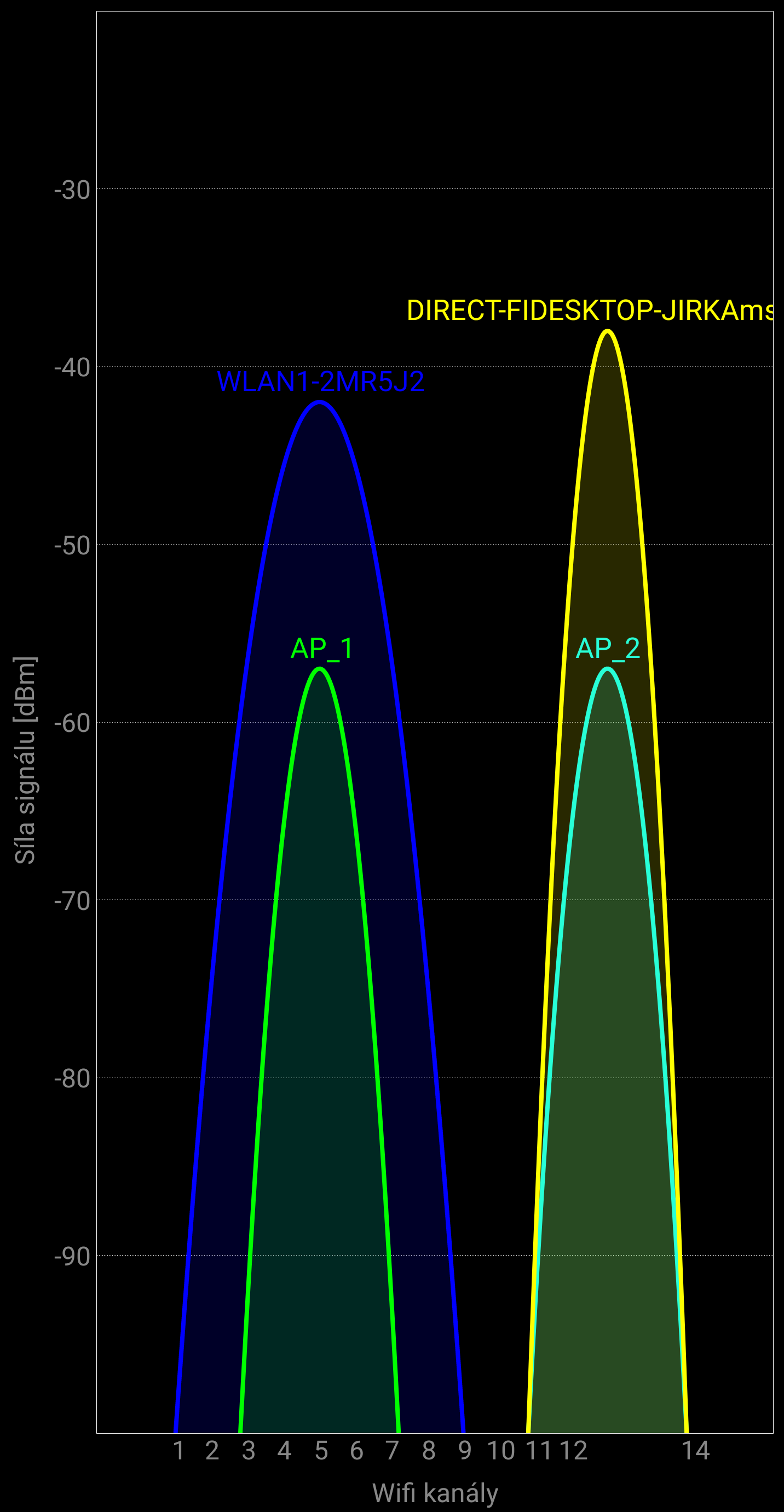 Bohužel z toho článku nejsem moudrý. Moje chyba - nejsem odborník a na angličtinu používám translator. Nicméně mám pocit že si nerozumíme. Na obrázku z app WIFI analyzér v pásmu 2G je vidět, kde a jak vysílá router (modrá křivka). (V reálu jsou tam vidět ještě signály dvou TPlinků). Červená křivka je z WiFi Directu mého notebooku který se právě zrcadlí na TV (LG). Můj problém je, že bych potřeboval vysílač z notebooku přemístit na jiný-pevný kanál. V tomto stavu se jeho "kanalizace" mění - přeskakuje a to jak na potvoru tam, kam jsem něco ručně napevno nakonfiguroval. Nedávno před tímto zobrazeným stavem jsem tu červenou křivku měl na prvním kanále. Když teď uhnu s modrou křivkou někam dolů za čas se červena postěhuje za ní. Potřeboval bych ji nakonfigurovat na pevné místo. Připomínám že tam ještě patří dvě křivky (1. a 11. kanál). (2 přílohy)