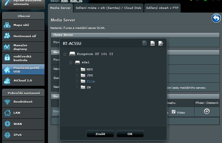 Do běžící routeru RT-AC51U jsem do USB portu připojil HDD. V nastavení routeru jsem povolil DLNA media server. Na stejné síti jsou dvě televize samsung, které vidí složky Video, Music a Photos toho media serveru a pravděpodobně by přehrály i jejich obsah. Bohužel na žádném z PC připojeným do té samé sítě nevidím výše zmíněné složky. Jinak HDD je normálně vidět - lze s ním pracovat jako se "síťovým" diskem. Nějaký nápad, jak naplnit složky DLNA? Zkoušel jsem i přístupy přes FTP a stále nic.