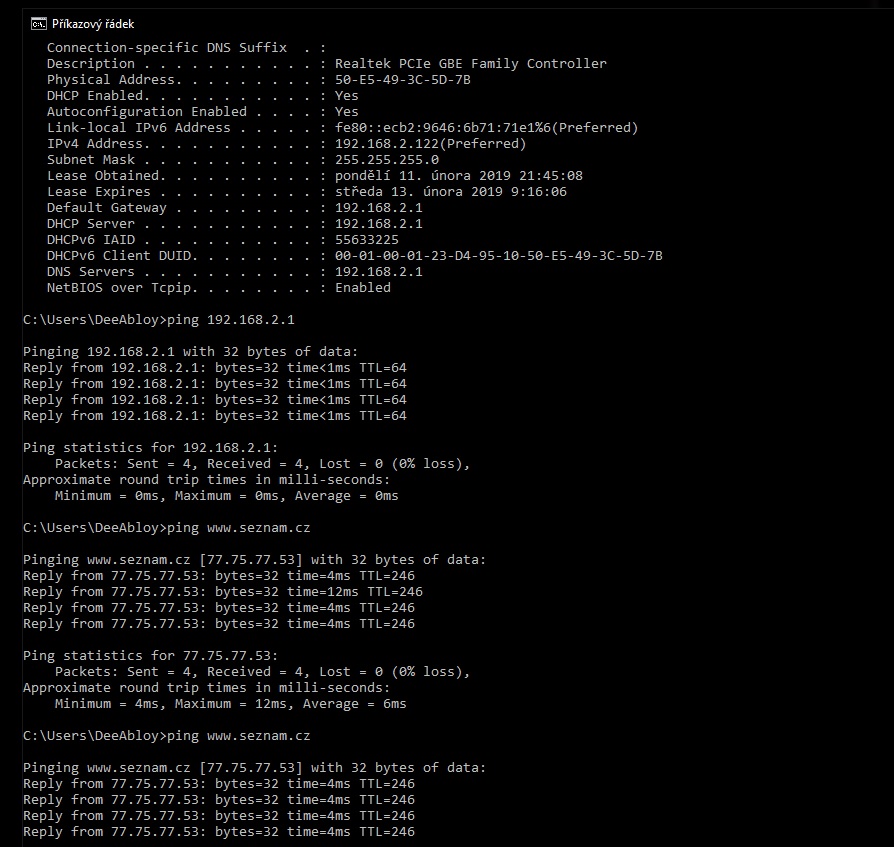Tady máš ipconfig, s tím že DNS jsem ted změnil na 8.8.8.8 a 8.8.4.4 ...