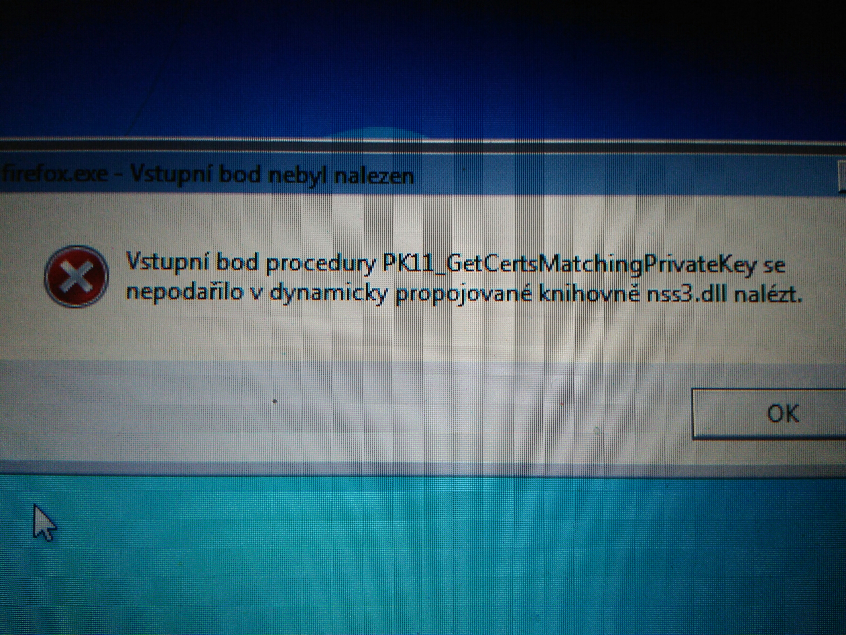 Vstupní bod procedury Pk11 GetCertsMatchingPrivateKey se nepodařilo v dynamicky připojované knihovně nss3.dll nalézt.