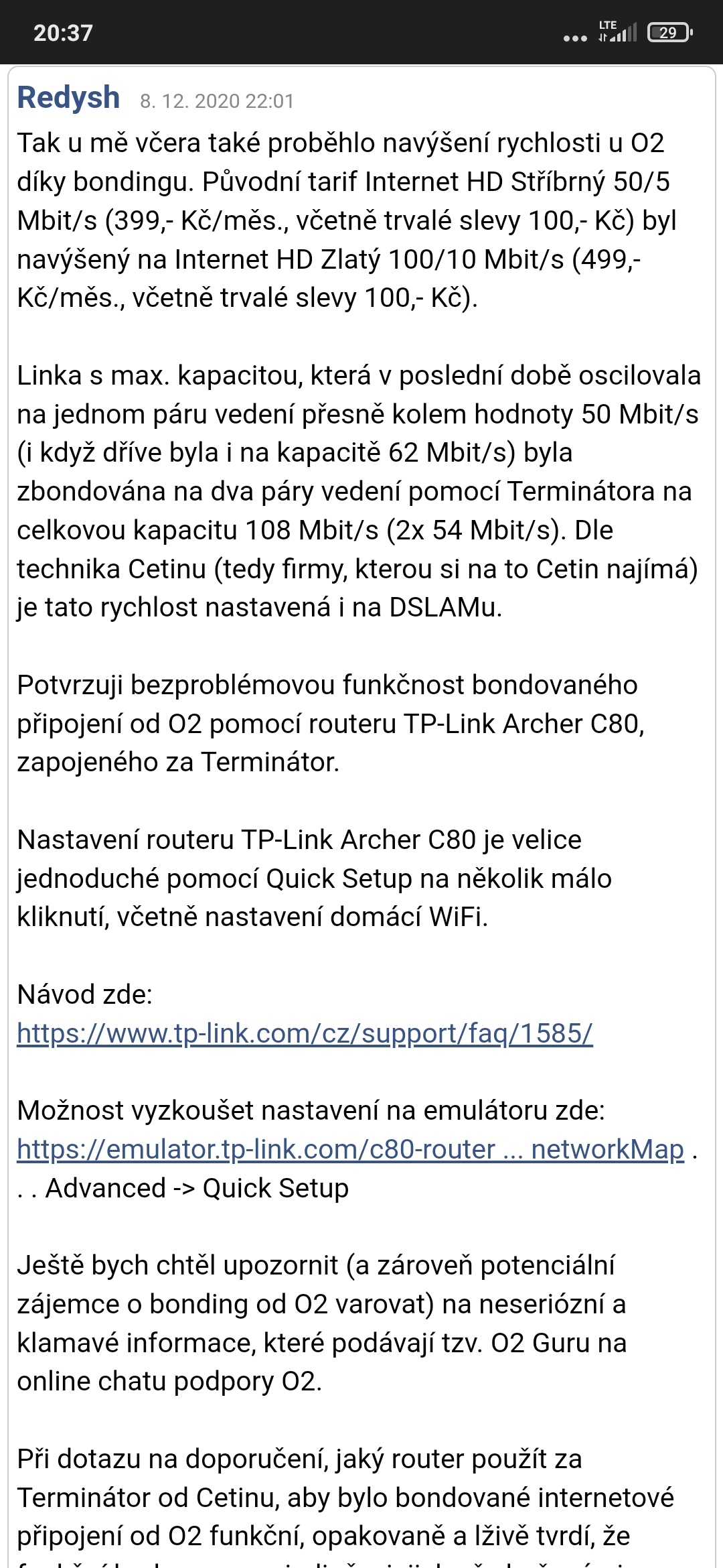 Na terminátoru svítí všechny čtyři LED diody zeleně, když odpojím kabel do routeru jedna z LED na terminátoru zhasne, což bych řekl že vylučuje chybu kabelu který je nový stejně jako C80 router, router C80 jsem koupil po přečtení příspěvku v náhledu, kde uživatel potvrzuje funkčnost internetu.