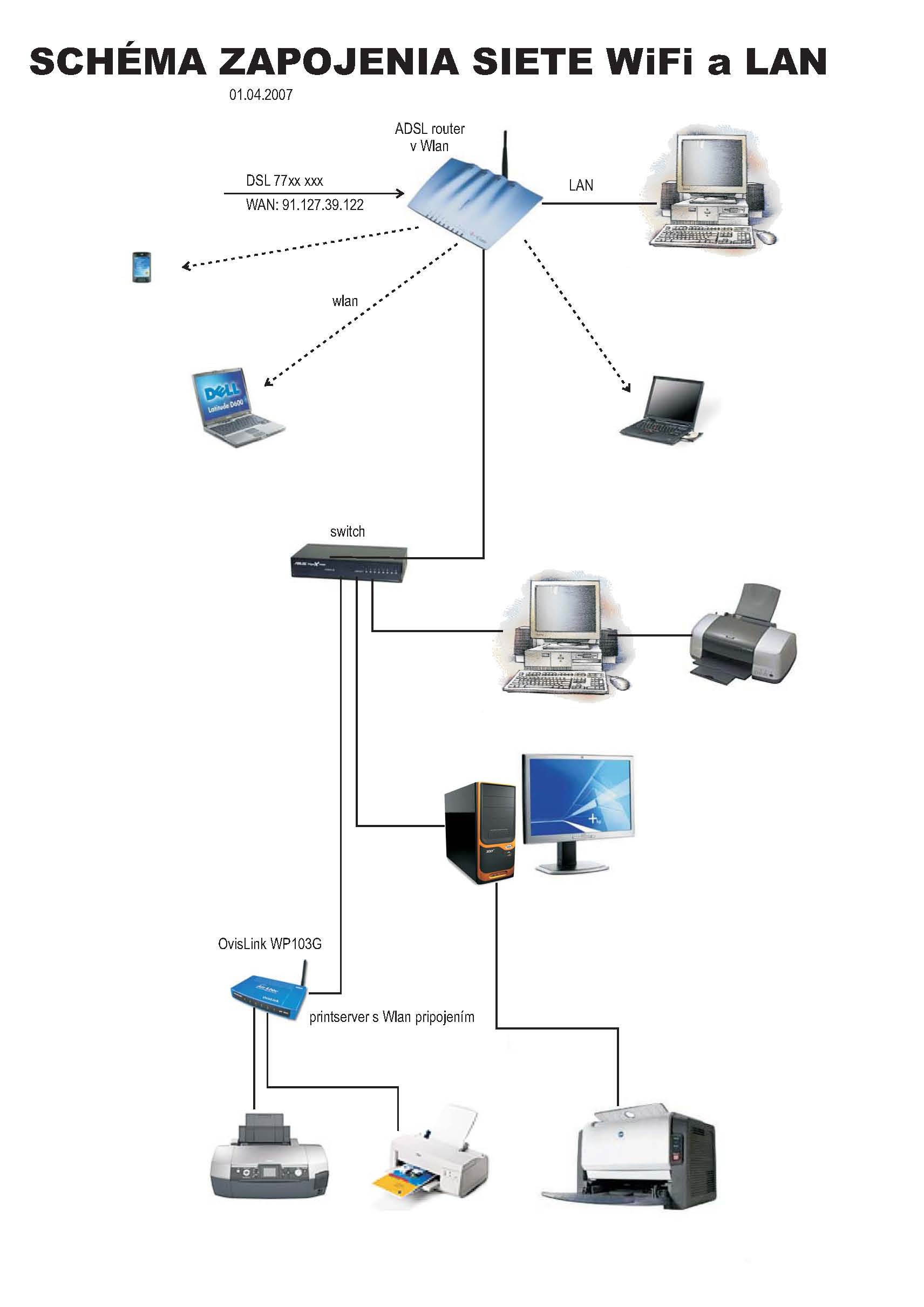 síť lze realizovat pomocí routeru. Podle typu připojení (ADSL nebo WAN) to jsou například: