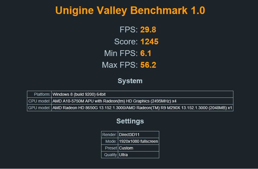 Přidávám screen z notebooku MSI GX70 Destroyer s grafikou R9 M290X, myslím si, že na notebook slušný výkon.