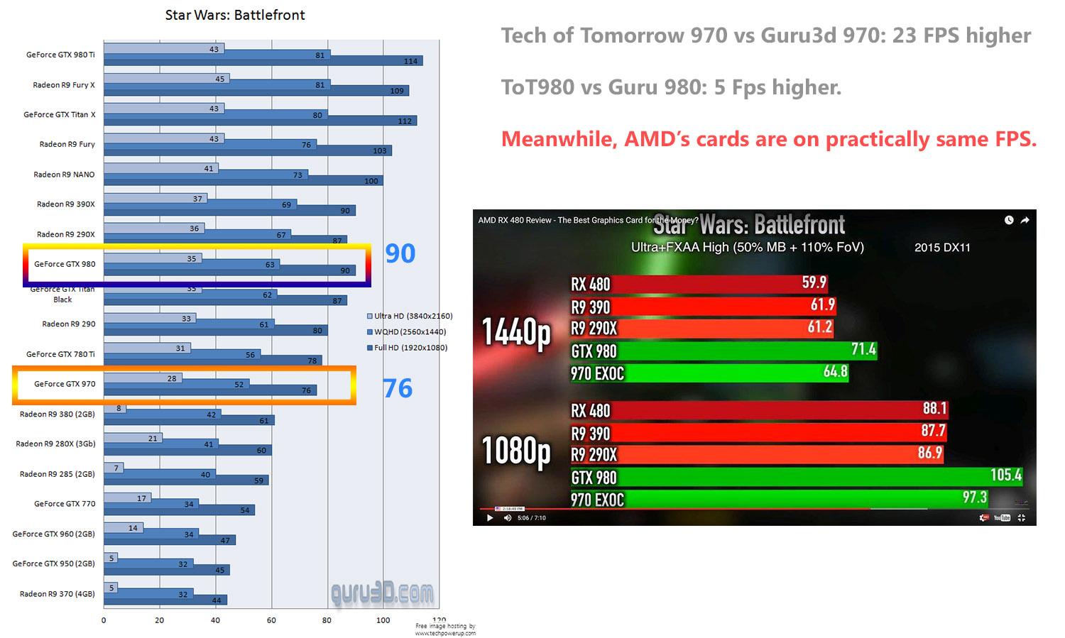Pokud je výkon GTX 1060 na úrovni GTX 980, jak se všude jinde tvrdí, RX 480 je podle toho o 10% výkonnější než GTX 1060. A teď si vyber. Buď je GTX 1060 výkonnější oproti RX 480 o 20% nebo RX 480 je oproti GTX 1060 výkonnější o 10%. Minimálně jeden z nich jistojistě lže.