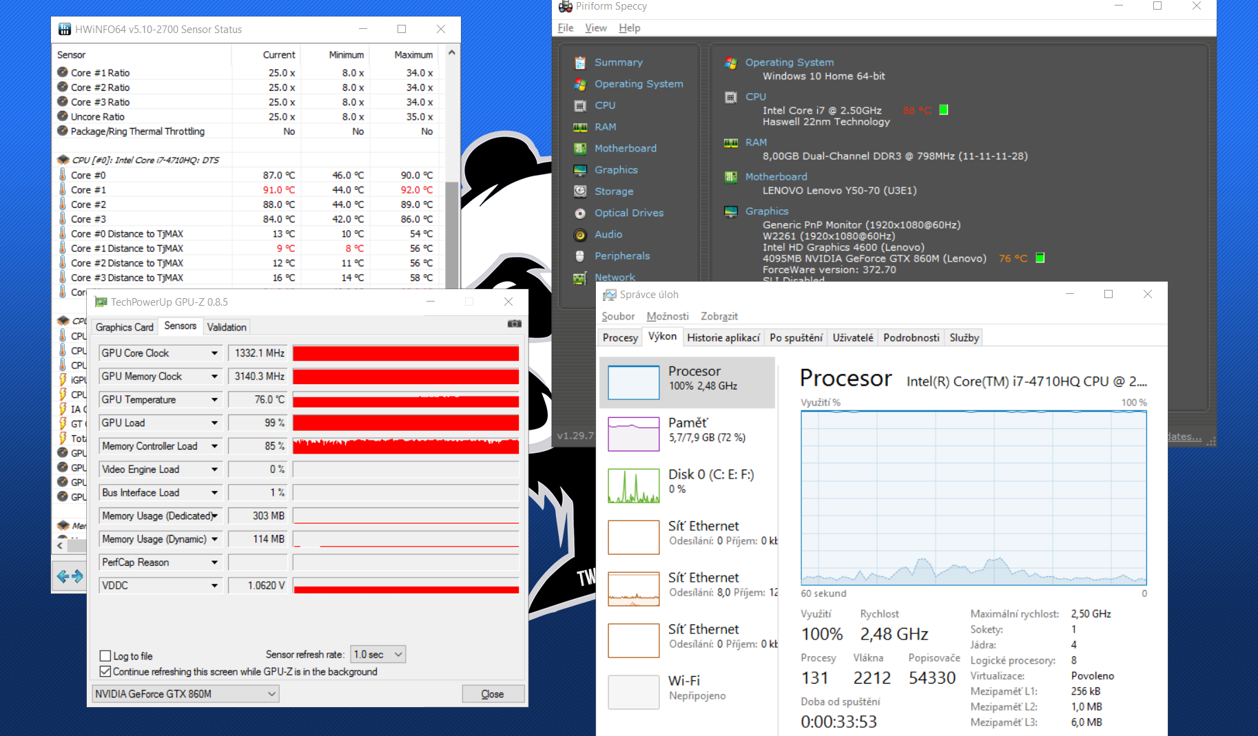 Zdravim, mam notebook lenovo y50-70 s GTX 860m maxwell a i7-4710HQ. Trochu jsem si pretaktoval grafiku (jen pres software) bez zmeny voltage, jadro +230 a pamet +630, vse je stabilni i teploty (viz screen: prime95 cpu max load + 3 graficke stress testy naras), pri normalnim hrani mam o dost nizsi teploty.