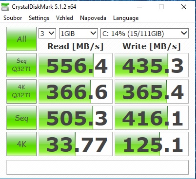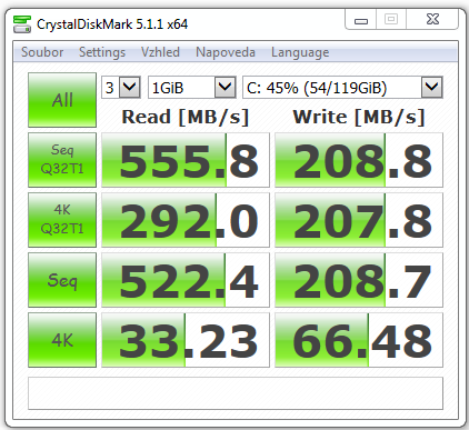 Celkem mě překvapilo, když jsem test spustil dvakrát, rychlost se někde lišila i o 20MB/s.