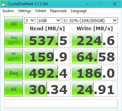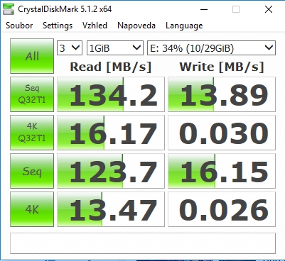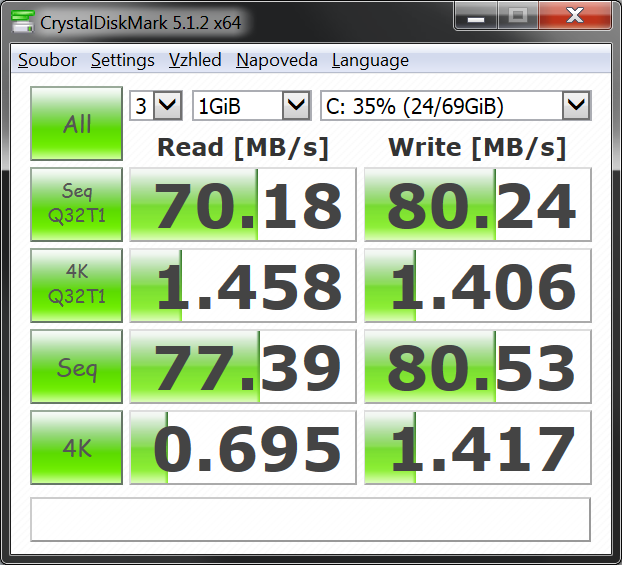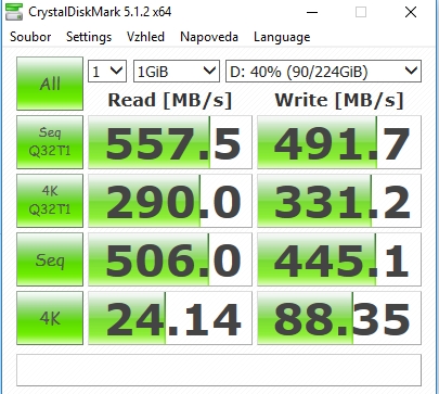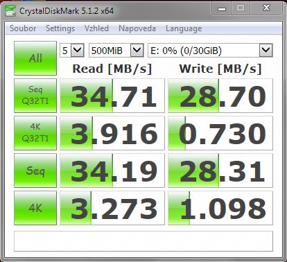 Je fakt, že ve srovnání s http://www.pc-help.cz/viewtopic.php?p=1353313#p1331639 nic moc... Rychlosti se lišit mohou, protože CDM ukazuje max dosaženou, a ta se může lišit dle toho, jak zrovna OS šahá na disk...
