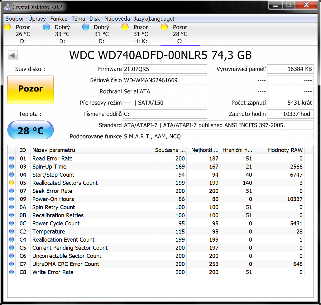 Po 15 měsících jsem zapnul tento program a ukázalo mi to zhruba o 30 MB/s menší rychlost oproti dřívějším výsledkům. Takže čím je HDD starší (opotřebovanější), tím je pomalejší?