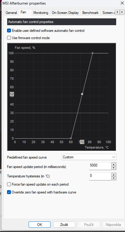 Takže když tu křivku nechám takhle a držím se do 72 stupňů, tak je to ok ? Protože když dám defaultni nastavení, tak se držím na 66 stupňů, ale větráky mi jedou třeba okolo 60%, takhle mi jedou na 45-50% a jsem okolo těch 70 stupňů