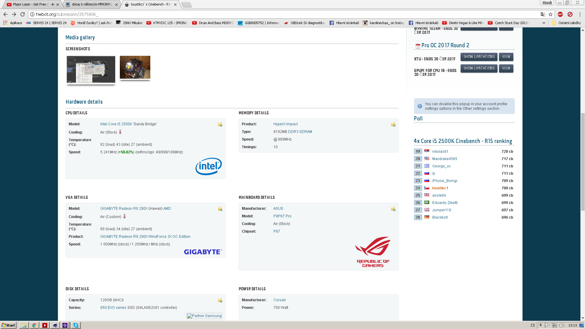 AMD FX-8350@5GHz stabilní, Asus Crosshair V Formula-Z, 2x 4GB 2400MHz TridentX, AMD Radeon HD6870, SSD Kingston HyperX 256GB, cca 2TB pevné disky, Corsair TX850W. Další HW: AMD x4 955 BE, 965 BE, 970 BE, 975 BE, 980 BE, 1090T BE, 1100T BE, FX-4300, FX-6300, FX-8320, FX-8350, FX-9370 atd