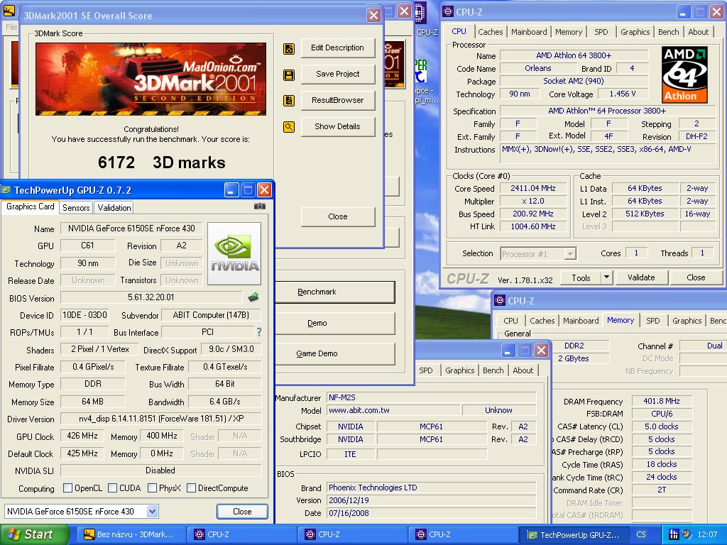 1) základ bez přetaktování na ACER E380, deska MCP61PM-AM REV: 1.0, BIOS ABIT NF-M2S