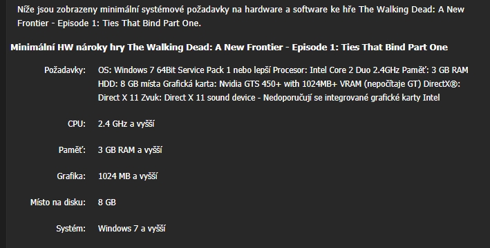 Nicmene jak jiz bylo receno, Telltale, autor podobnych her, zrusil podporu starsich verzi Direct X, takze hra vyzaduje (opravdu vyzaduje, ne doporucuje) grafickou kartu s podporou Direct X 11, kterou ale nemas a neni zadna moznost ji tam pridat. I kdyz nainstalujes Direct X 11 (software) tak to bez podpory DX 11 ze strany graficke karty nepujde.
