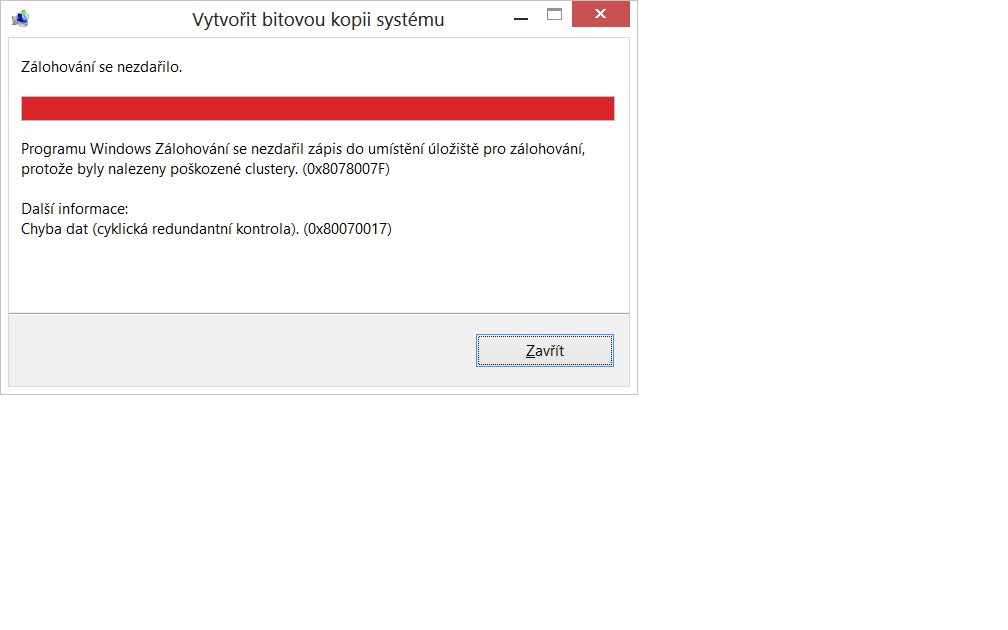 Dobrý den. Chtěl jsem udělat Bitovou kopii systému Windows 8 na externí disk a po několika hodinách mi to napsalo : ZÁLOHOVÁNÍ ( NA EXTERNÍ DISK H ) SE NEZDAŘILO. BYLY NALEZENY POŠKOZENÉ CLUSTERY. ( 0x8078007F ).