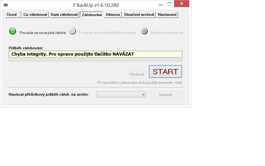Dobrý den. Nedaří se mi nastavit přírustkovou zálohu v 7 BackUp. Mám plnou zálohu na disku G. Kam zálohovat : dal jsem tuto složku se zálohou, pak jsem dal : POUŽIJ. Potom jsem dal : ZÁLOHOVÁNÍ a napsalo mi to, že je chyba integrity. Pro opravu použijte tlačítko NAVÁZAT. Tlačítko ale není aktivní. Tak bych prosil, jak to mám nastavit-přírustkové zálohování. Děkuji.