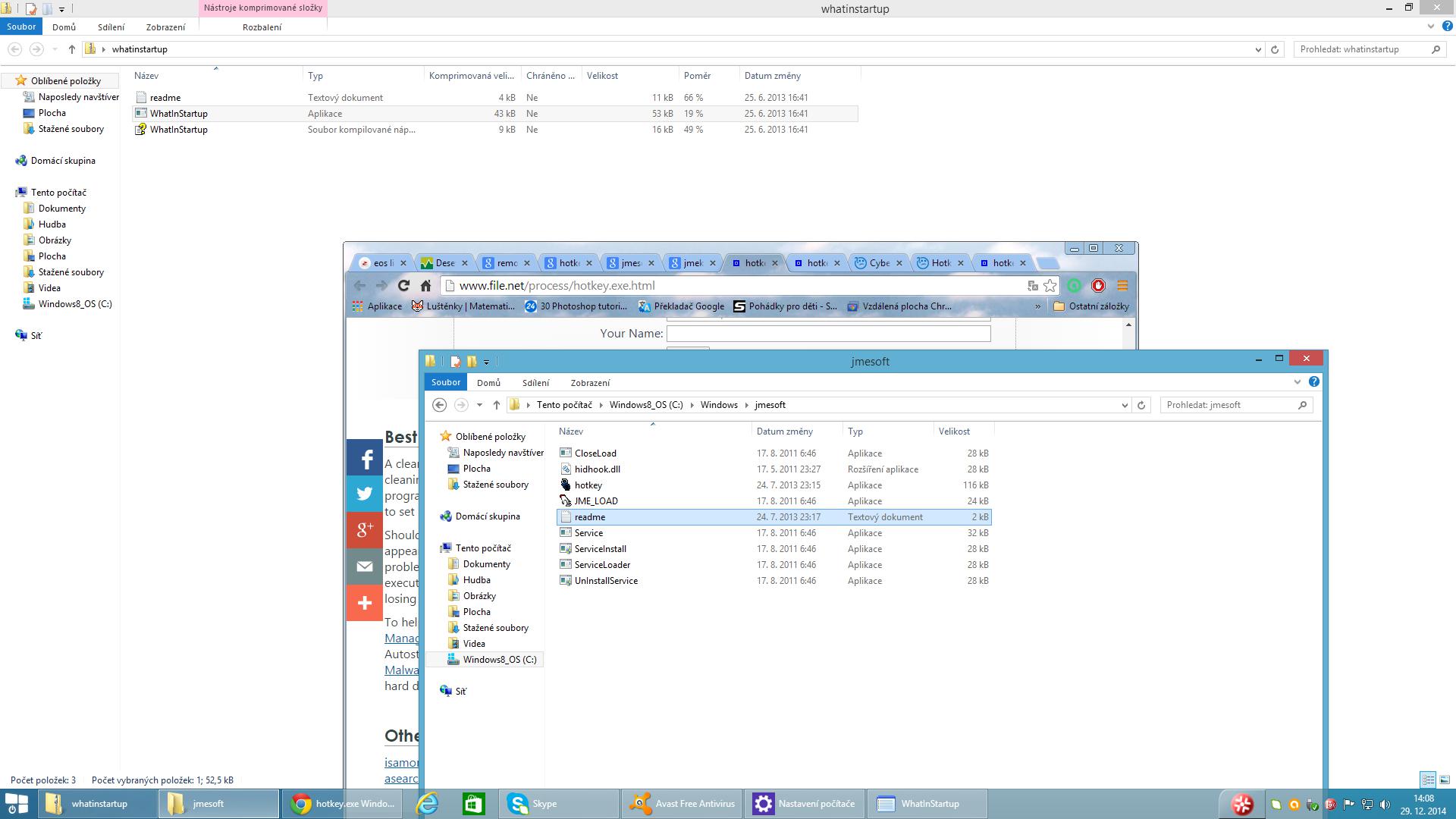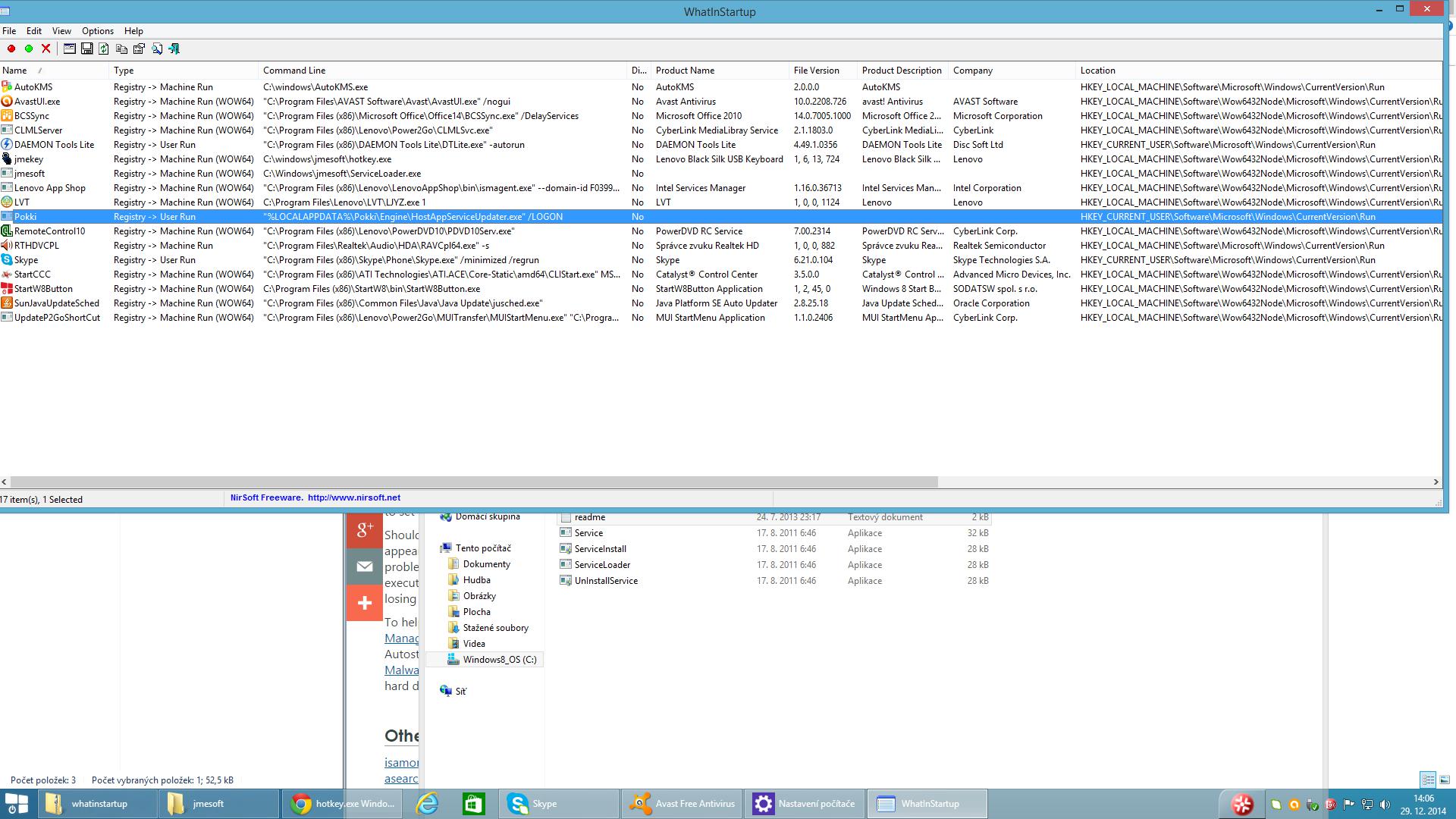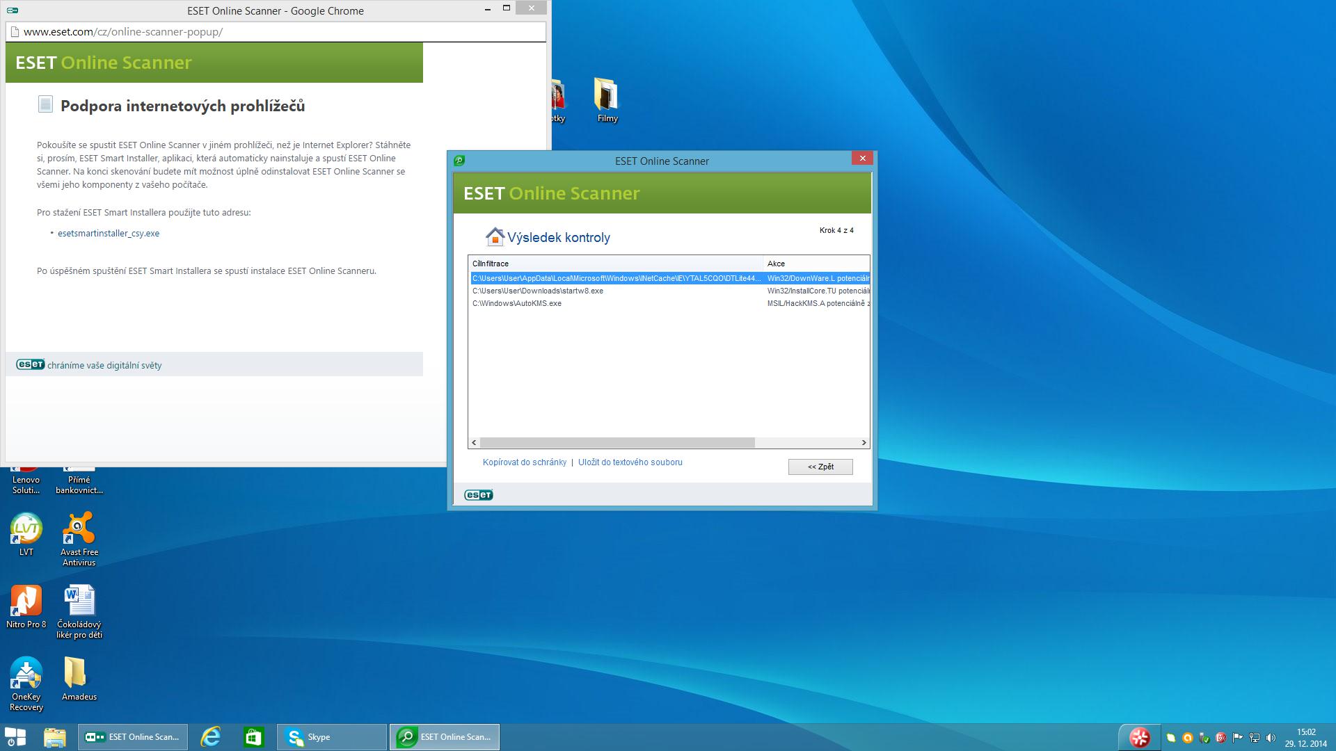chtěl bych pomoct kamarádce a protože se jedná o problém s počítači, kterým na potřebné úrovni rozhodně nerozumím, zkouším co se dá. Kamarádky potíž spočívá v tom, že manžel jí prokazatelně lezl do freeemailu a to ačkoliv si opakovaně měnila heslo. On počítačům dost rozumí, ona si sotva umí změnit to heslo. Každopádně teď se manžel od rodiny odstěhoval i s tím svým původním počítačem a nechal tam ženě (mé kamarádce) počítač nový (vím o něm jen to, že to jsou nejspíše windows8). Protože kamarádku manžel podváděl nejen s počítačem, má teď obavy, jestli může věci jako rozvod a péči o děti řešit po emailu, jestli se jí tam manžel stále nemůže dostat. Uměli byste poradit? Bohužel je to tak, že já bydlím 300 kilometrů daleko a ona je pc antitalent. Dnes jsme se vraceli z Čech a zastavili se u ní. Nejsem žádný expert a zmohl jsem se pouze na to prolustrovat to programem WhatInStartup a spustit ESET online scanner. Neumělý výsledek mého snažení přikládám. Pokud se někdo odhodlá mi poradit, prosím mějte na paměti, že do Čech teď nejedu a že ona moc složité postupy nezvládne. Děkuji každopádně předem za jakoukoliv snahu. Zbyněk