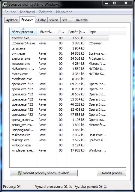 Vše proběhlo v pořádku všechno je správně ovšem všiml jsem si vysokého využití paměti a procesoru procesor okolo 60% a více, a pamět 4,3/8gb mám pouze zapnutý internet 1 záložku, předtím takové vysoké využití nebylo použil jsem program DriveClone (ze stránky: Stahuj.cz) není možné že ten program sebou něco "propašoval"? Případně co s tím jak to mám zarazit? Ve správci úloh v procesech není nic podezřelého, antivirus nic neodhalil: microsoft security essentials
