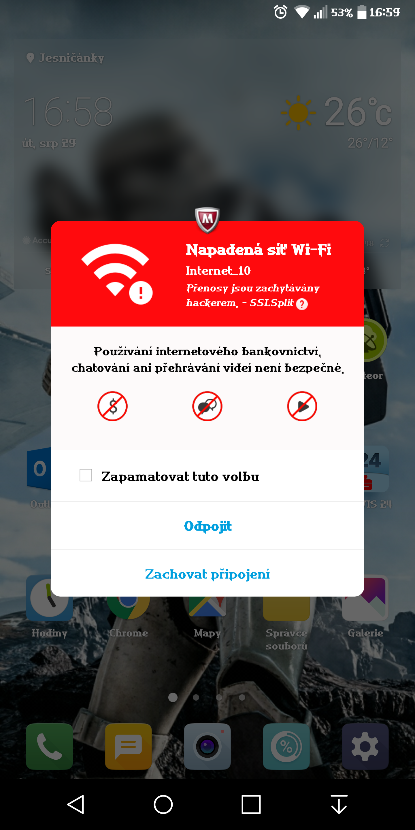 Ahoj, dnes když jsem přišel domů a připojil se k wi-fi, tak mi v mobilu naskočilo upozornění od McAfee Security, že je wi-fi napadena hackrem. Ihned jsem se od wi-fi odpojil, ale teď marně hledám nějaké řešení. Nemohu najít ani kontatk na O2 podporu....pořád narážím jen na reklamy. Můžete mi poradit, jak se mam chovat? A co mam pro zabezpečení udělat?