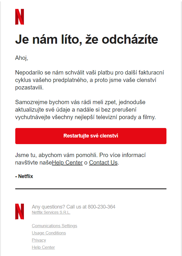 - po cca 2 letech platba z neznámého důvodu nebyla přijata netflixem a vrátila se
