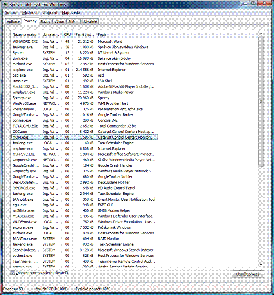 už nevím si rady,ale poslední dobou cca 4 měsíce bojuji se zamrzáním PC a 100% vytížeností CPU. Zkouším co se dá, od čištění SW přes výměnu vadného ventilátoru,ale vždy se to objeví znovu.Doufám,že mně něco poradíte a zvítězím. Dnešní příklad procesů po cca 30 min totálního zatuhnutí zase to jede normálně, proces který to vytěžuje nejvíce je každou chvilku jiný např. iexplore.exe,ekrn.exe ...