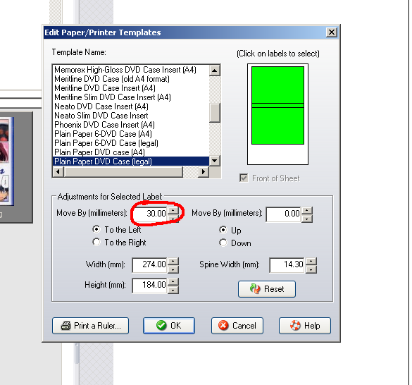 V horním menu -> Edit -> Edit Paper/Printer Templates (úplně dole) -> do kolonky "Move by (millimeters)" napište 30, nechte "To the Left", viz. obrázek:
