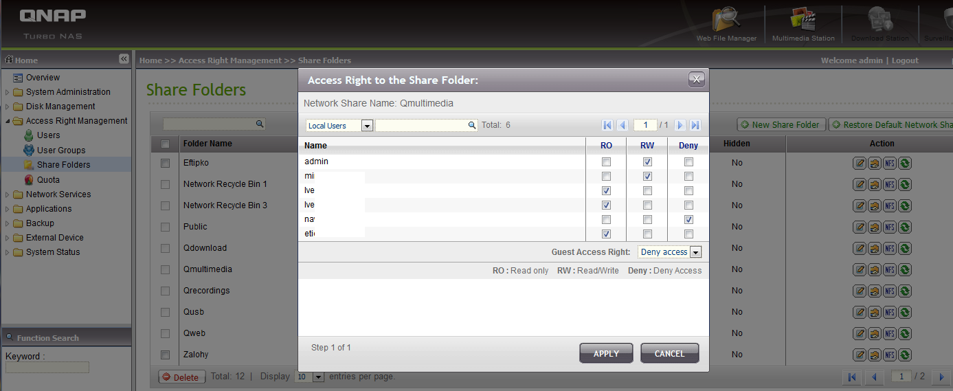 Dále je třeba sdělit OS NASu, kteří uživatelé a pod jakým heslem budou moci ke sdílení přistupovat.