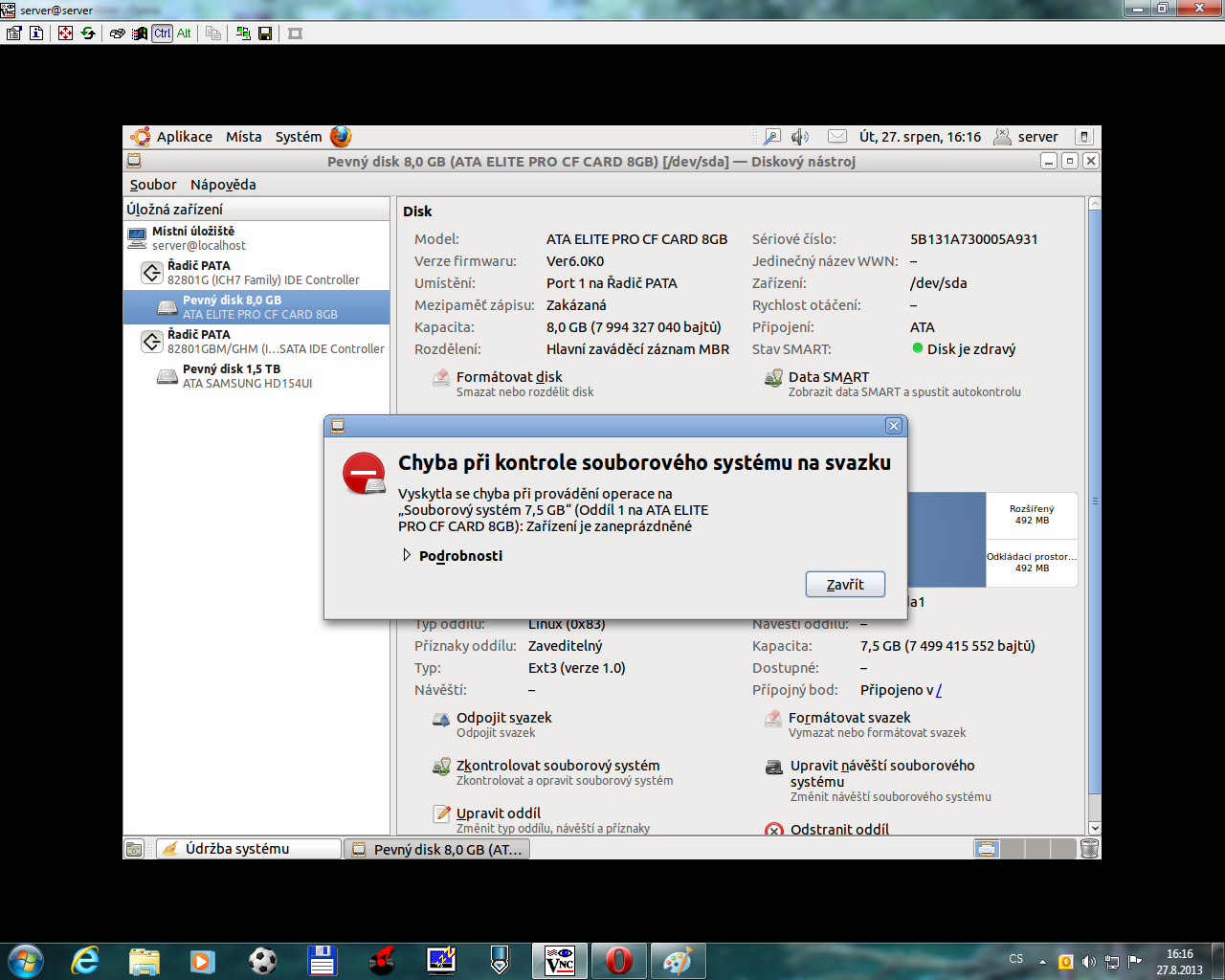 Při startu ubuntu system zničeho nic vyžaduje kontrolu disku, která se zastaví asi na 7% a dál se nic neděje. Pokud ručně přeruším kontrolu, system normálně naběhne a je vše funkční /je používán pouze jako datový server/. Při pokusu o zpuštění ruční kontroly se objeví tato hláška.
