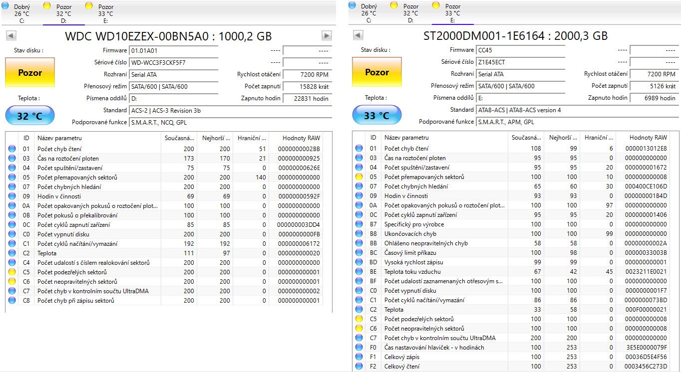 Tady sú screeny tých HDD, myslíš že sú špatné? Ja som na to hned koukal že sú tam nejaké špatné sektory, chcelo som zapnout kontrolu disku a defragmentaci ... jako disk s nejakými špatnými sektormi je v pohode alebo je to známka že sa pomály odporúča?