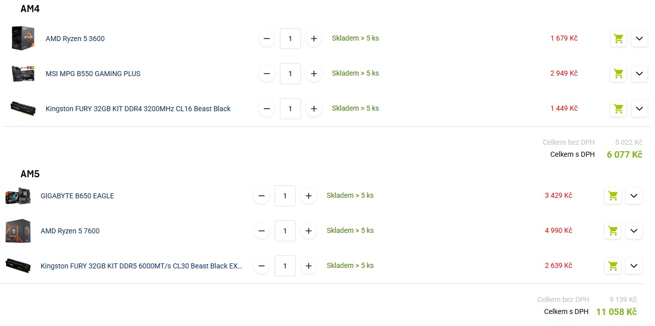 Rýchle porovnanie snáď to mám nejak rozumne ale vychází mi hlavne koli procesoru cena skoro jednou tolik u AM5, výkonovo myslím že 3600 není úplne mimo: