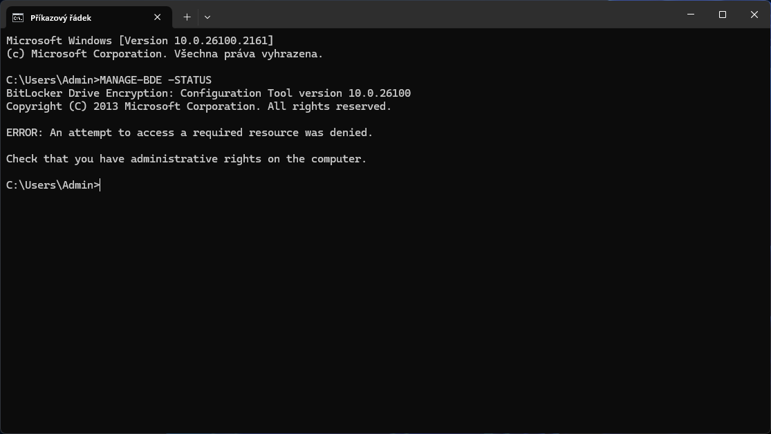 Tu prikazovou radku musis spustit jako administrator, jinak nemas opravneni na ovladani Bitlockeru.