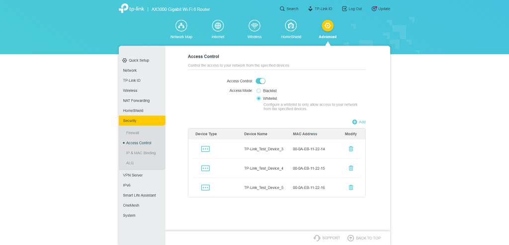 Např. TP-Link AX53 tuto funkci má (Advanced/Security/Access control).