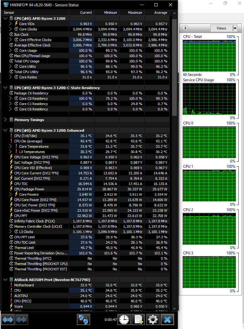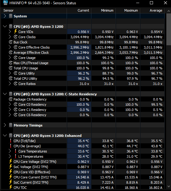 Zdravím, poslední dobou jsem sledoval, že se mi na počítači vše více seká a procesor jede na 100%, ale má pouze kolem 42 stupňů. Dnes jsem se rozhodl ho přetaktovat na 4GHz, zvolil jsem napětí asi 1.35V a spustil Cinebench, můj Ryzen 3 1200 dosáhl výsledku 223 bodů, což je zvláštní, tento procesor by měl mít výsledek téměř 600 bodů. Mám také lepší chladič, ne základní od AMD.